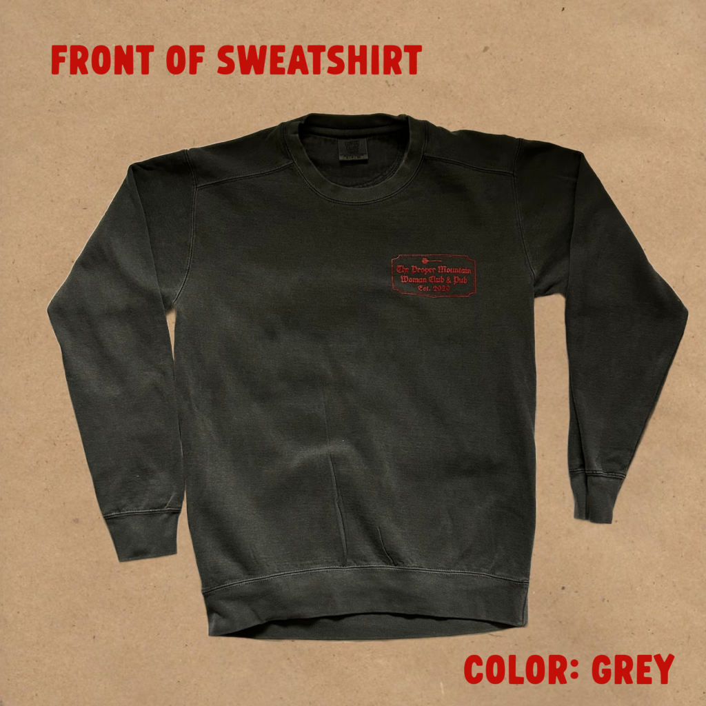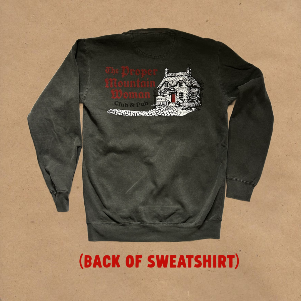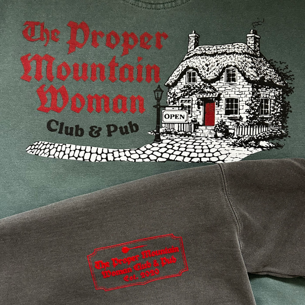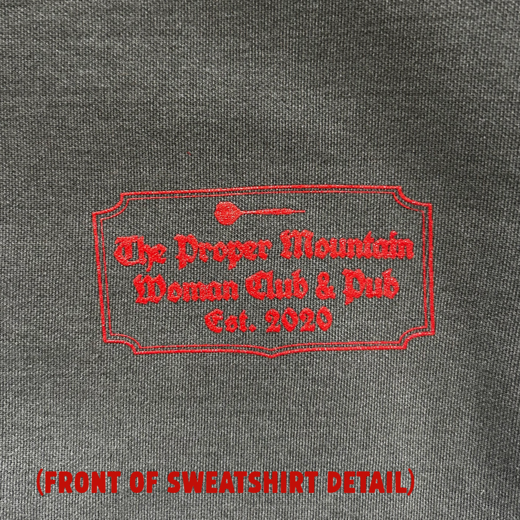 Inspired by a crewneck sweatshirt you may have come across on holiday while walking down a quaint cobblestone road, and popping in for a bite at an old London pub. This crewneck features the Proper Mountain Woman Club & Pub emblem on the front and a vintage-style pub illustration on the back. We like to imagine this pub is a gathering place for troop members to meet, throw darts, swap field reports, and steady their aim for their next challenge.